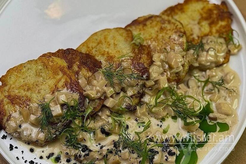 Деруни з вершковим соусом з білих грибів з додаванням цибулі.