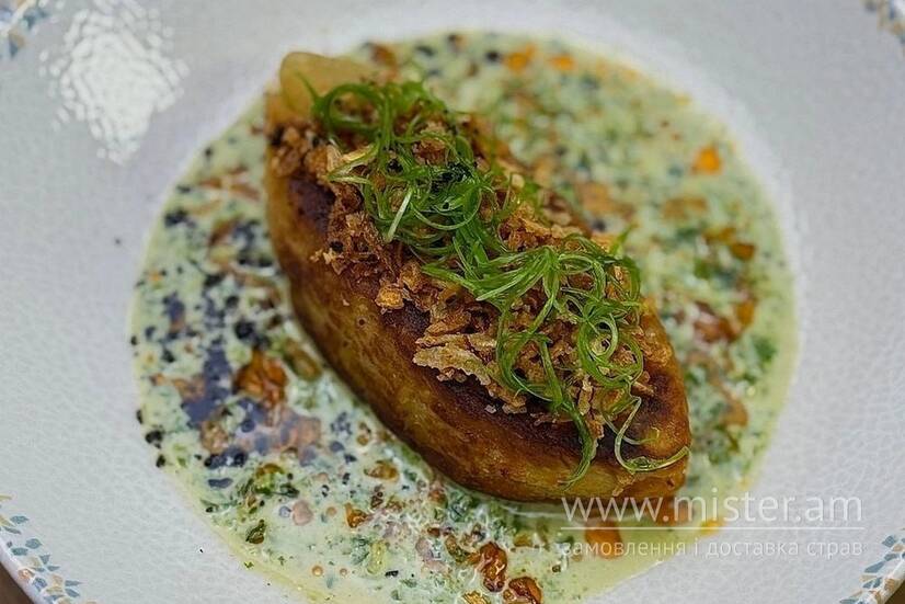 Картопляник з томленою свинячою шиєю, сиром та овочами.