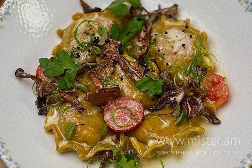 Вареники з начинкою з томленого кролика та молодого сиру з топленим маслом та лисичками.