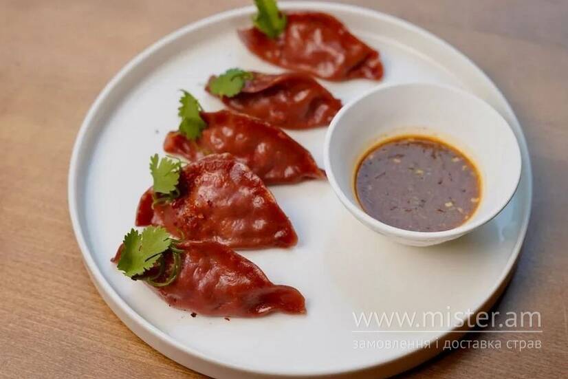 Ніжне, тонке тісто, приготоване на пару, з соковитою рваною яловичиною, ароматними грибами муер та пікантним соусом із кінзою.