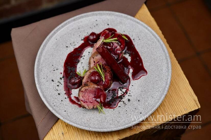 Ніжна вирізка яловичини, маринована у прянощах та соусах, підкреслена ароматом часнику. Завершує смакову композицію насичений вишневий соус, що додає яскравої кисло солодкої ноти.