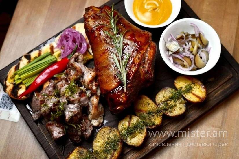 Щедра асорті-дошка для справжніх поціновувачів м’яса. До складу входить ніжна свинна рулька з румʼяною скоринкою, ароматний шашлик зі свинини та соковитий шашлик з курячого стегна . У якості гарніру — картопля з хосперу з запашними травами та свіжоспечений лангош. З доповненням гірчиці та освіжаючого салату із солоних огірків та кримської цибулі. Ідеальний вибір для компанії та тих, хто любить насичені, домашні смаки.