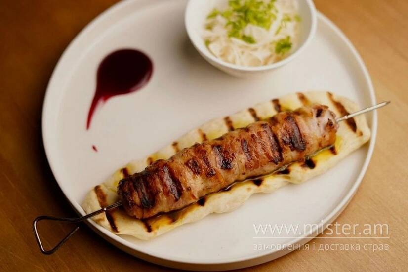 Соковитий фарш із телятини в оболонці з підкопченого бекону, приготований на живому вогні. Подається з хрустким лангошем та смородиновим гелем. Капуста маринована.