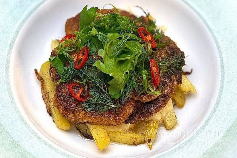 Смажені свинячі мізки в пряній паніровці з смаженою картоплею та соусом з селери з додаванням часнику.