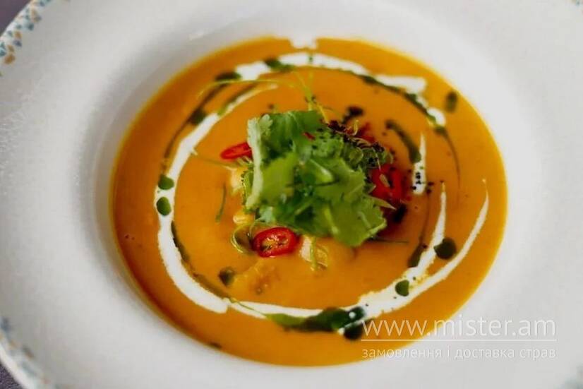 Теплий і густий гарбузовий крем-суп на кокосовому молоці з курячою копченою грудиною, білої квасолі та кінзи, з додаванням чілі.