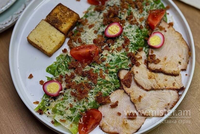 Класичний салат цезар з індюшиним пастрамі, кранчем з бекону та сухарями з бріоша. В страві є часник.