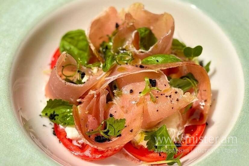 Літній салат з кремовою страчателою, солодкими томатами та тонкими скибками хамону.