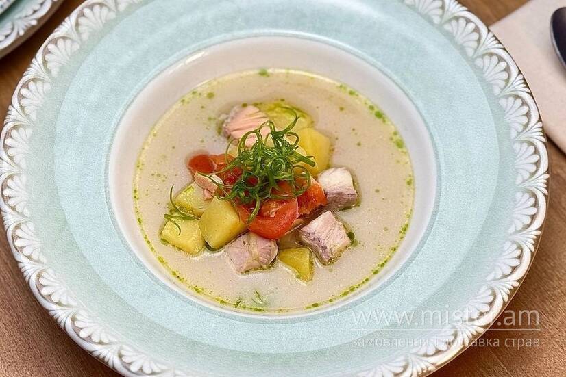 Уха з судаку та сьомги — насичений рибний вершковий суп з ніжним м’ясом двох видів риби, печеними овочами та духмяними спеціями. Вишуканий смак традиційної страви.