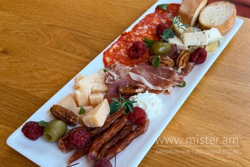Прошуто, гостра салямі, пармезан, сир гарганзола, кабаноси, оливки, крутони, горіх пікан цілий, крем сир.