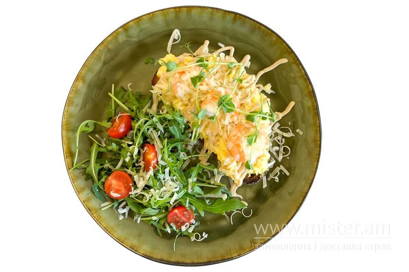 Масляний скрембл, соусом та смаженими креветками на запеченій хрусткій грінці, руколою, шпинатом та коктейльними томатами.