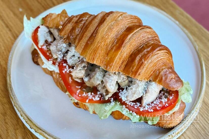 Хрусткий круасан з куркою, пармезаном, айсбергом, помідором та соусом Цезар.
