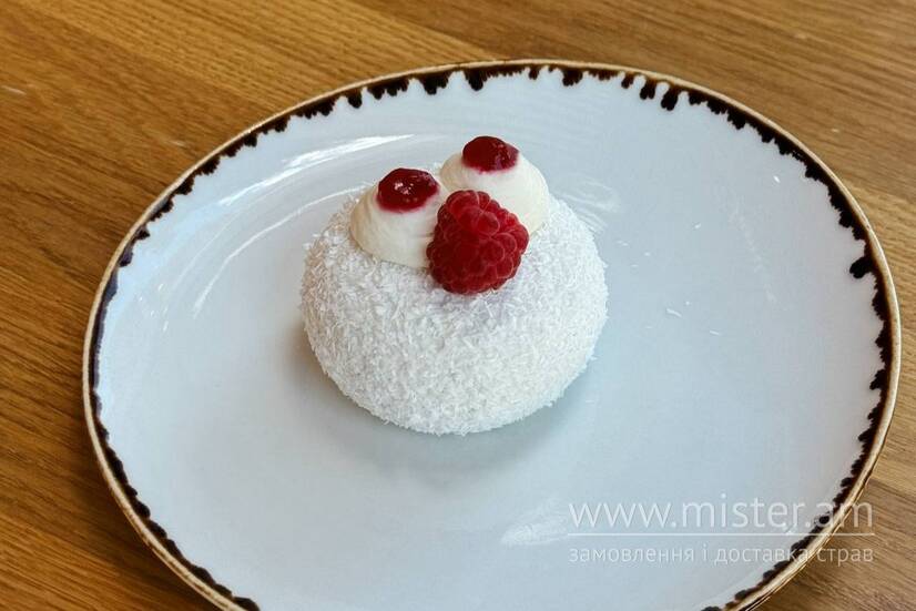 Кокосовий мус, малинове кюлі, кокосовий дакуаз.