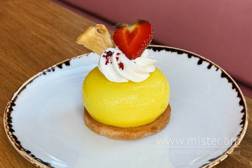 Банановий мус, полуничне кюлі, крем з маскарпоне, пісочне саблє.