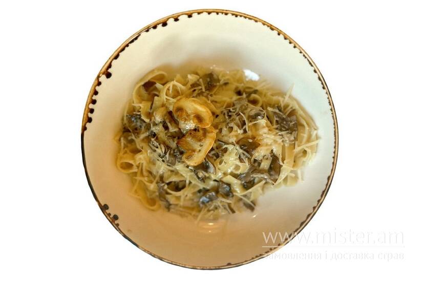 Паста тальятеле з печерицями, вершковий соус, цибуля, часник, пармезан.
