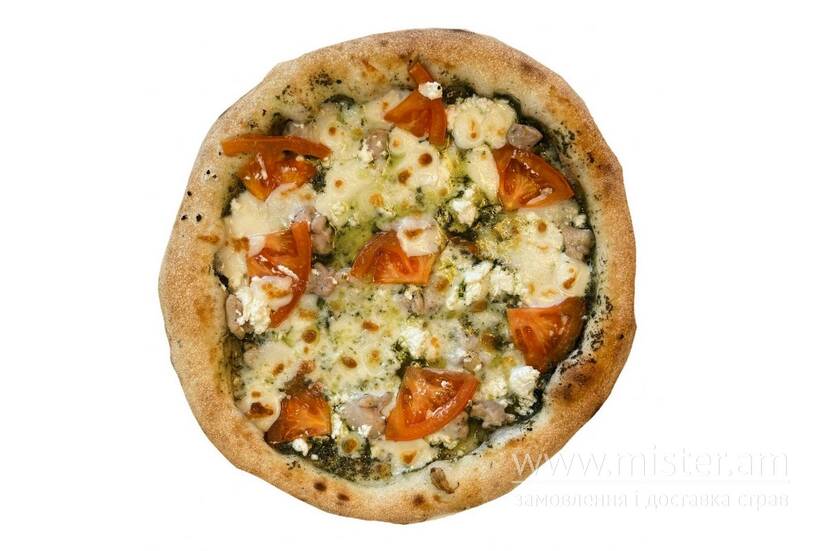 Вершковий соус, сир моцарела, куряче стегно, соус песто, сир рікота, помідор.