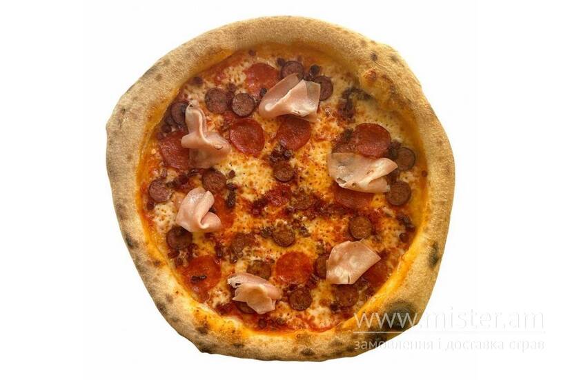 Томатний соус, мортаделла, ковбаски, кабаноси, салямі пепероні, моцарела.