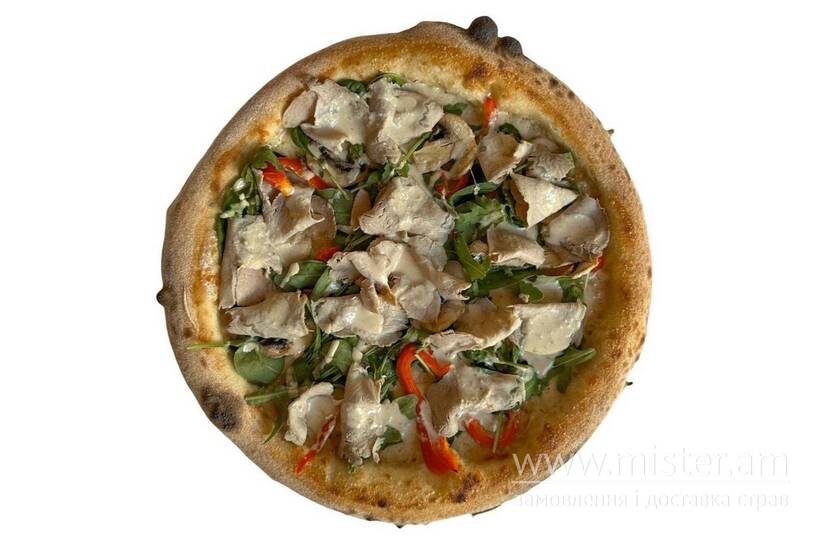 Вершковий соус, сир моцарела, м'ясо Вітелло Тоннато, печериці, перець болгарський, рукола шпинат, соус Вітелло Тоннато.