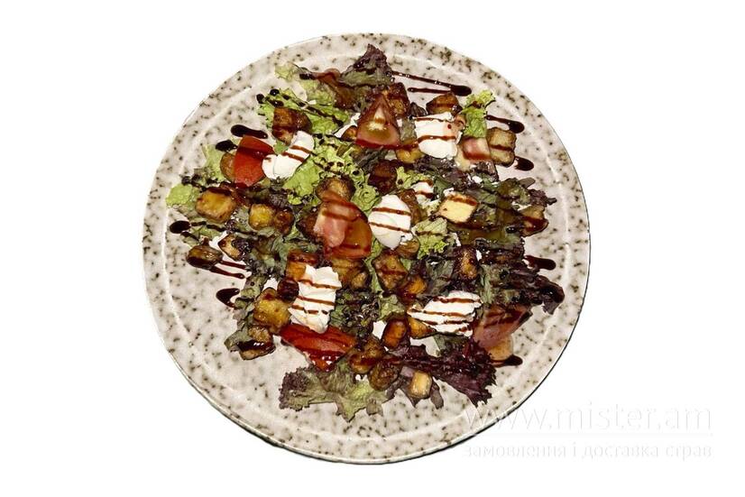 Баклажан, мікс салату, помідор, крем-сир.