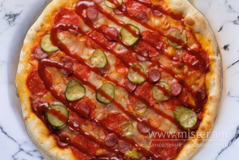 Моцарела, сулугуні, український, соус томатний, кетчуп, баварські ковбаски, салямі, перець халапеньйо, гриби, огірок.