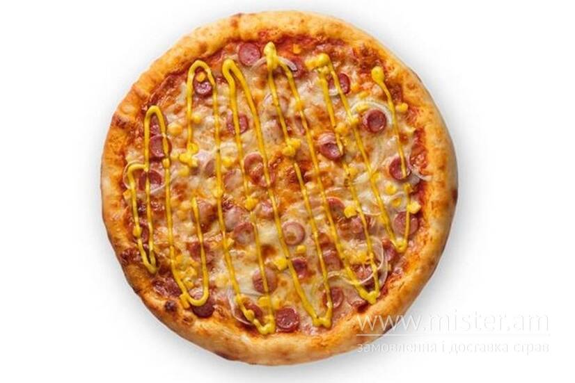 Моцарела, сулугуні, український, соус томатний, соус часник, гірчиця, баварські ковбаски, цибуля маринована, огірок, кукурудза.