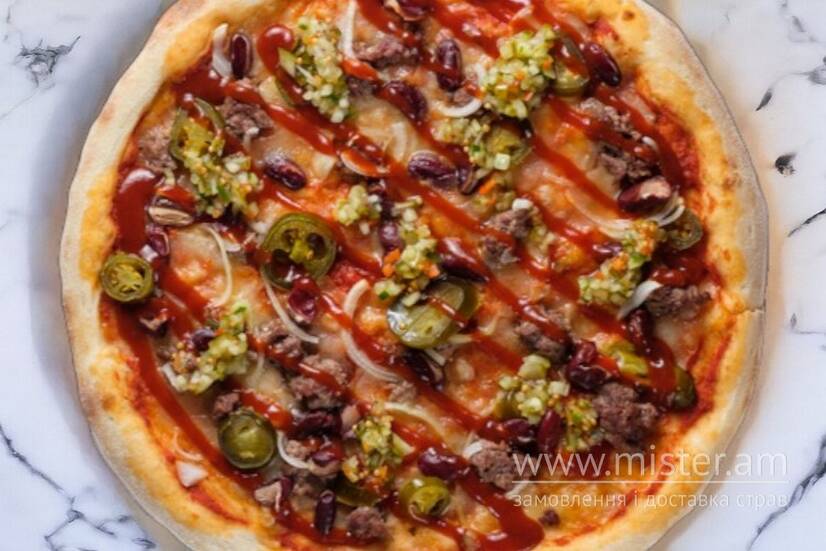 Моцарела, сулугуні, український, соус томатний, кетчуп, салямі, курка, помідор, перець халапеньйо, перець болгарський, цибуля маринована.