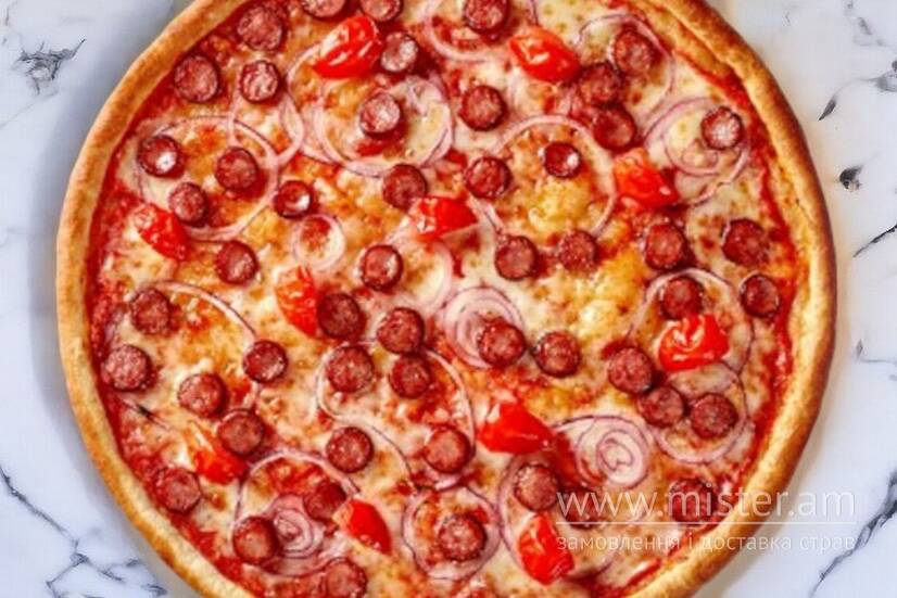 Моцарела, сулугуні, український, соус томатний, баварські ковбаски, перець халапеньйо, гриби, цибуля маринована.