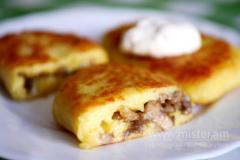 Борошно пшеничне, картопляне пюре, гриби смажені, яйце куряче, олія соняшникова рафінована, сіль кухонна, перець чорний мелений.
