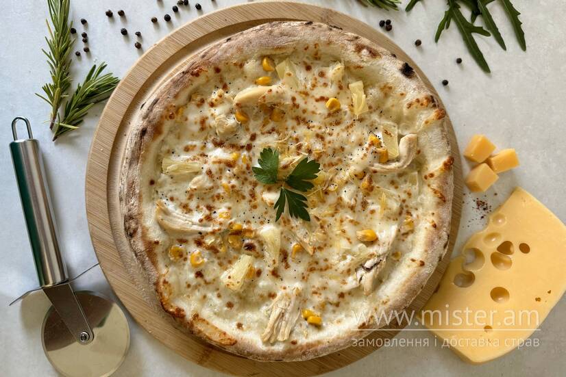 Тісто, вершковий соус, сир моцарела, філе куряче, кукурудза, ананас.