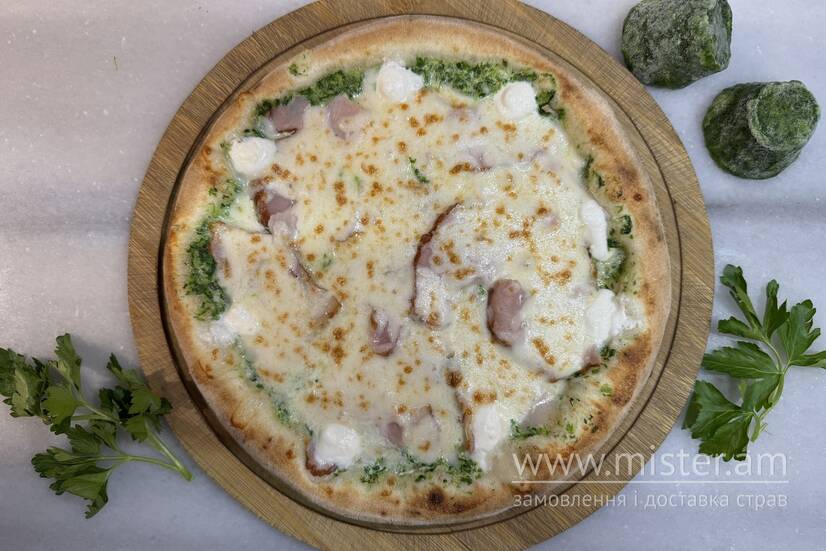 Тісто, вершковий соус, шпинат, сир моцарела, бекон, шинка, часник, крем-сир.