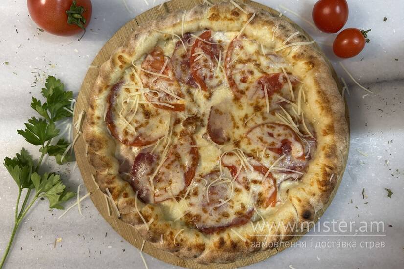 Тісто, томатний соус, сир моцарела, крем-сир у бортику, шинка, салямі, печериці, оливки, томати.