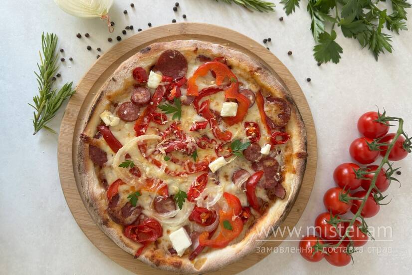 Тісто, вершковий соус, сир моцарела, шинка, салямі, ковбаски мисливські.