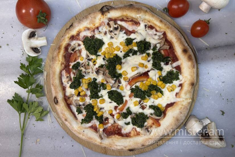 Тісто, томатний соус, сир моцарела, печериці, шпинат, перець солодкий, кукурудза.