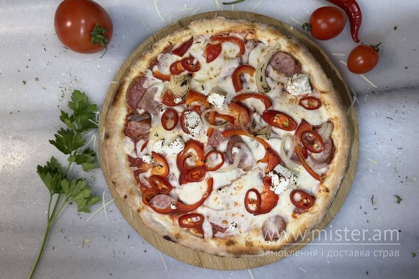 Тісто, томатний соус, сир фета, сир моцарела, шинка, бекон, салямі, ковбаски мисливські, перець солодкий, чилі, маринована цибуля.