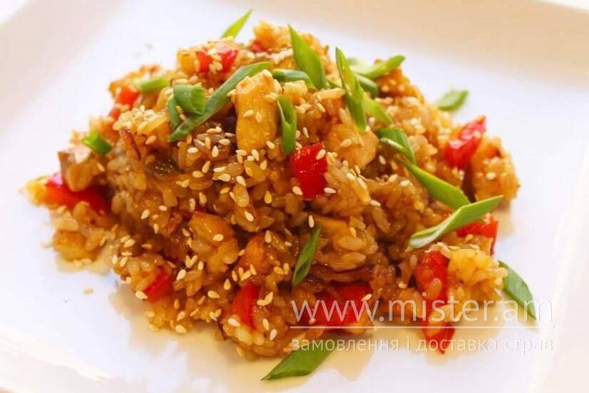 Рис, курка, часник, імбир, цибуля, солодкий перець, соєвий соус.