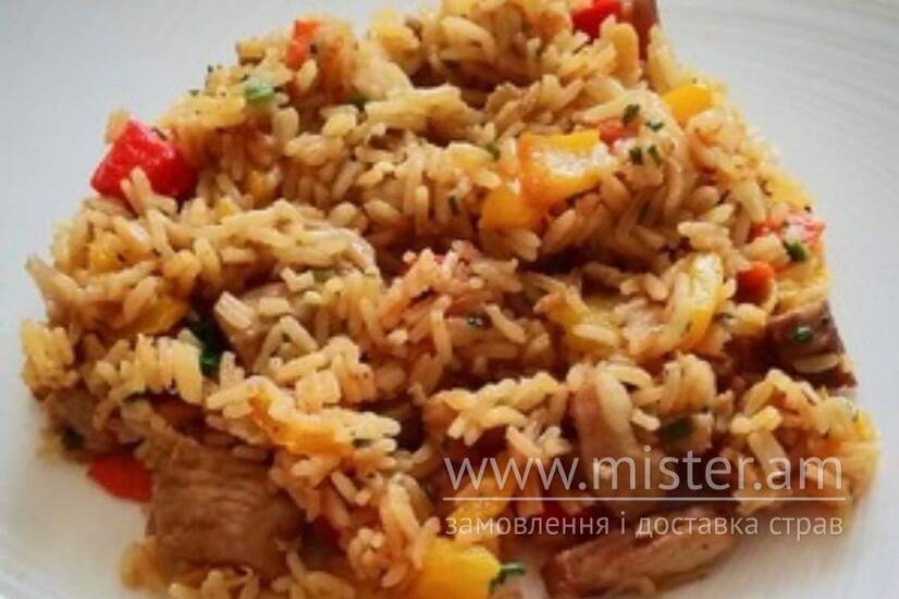 Рис, яловичина, часник, імбир, цибуля, помідор, перець солодкий, соєвий соус.