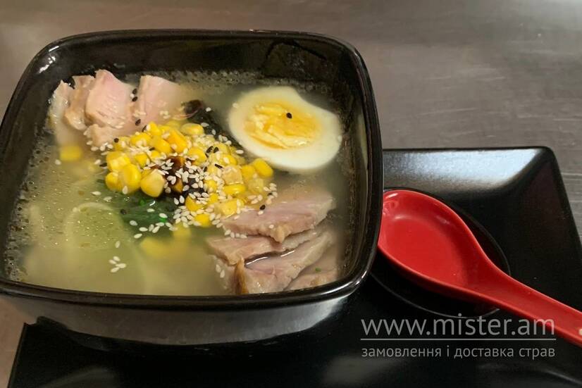 Курячий бульйон, куряче варене яйце, чука, локшина, копчене м'ясо, кукурудза.