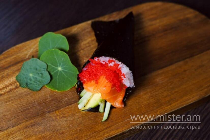 Рис,норі, огірок, авокадо, лосось, крем сир, ікра, спайсі.