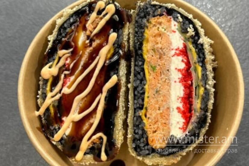 Рис з чорнилом каракатиці, сир Чедер, крем сир, ікра масаго, котлета з лосося, огірок, соус унагі, соус спайсі.