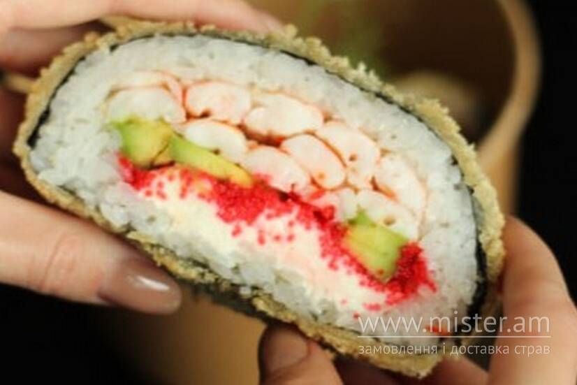 Рис, норі, темпура кляр, авокадо, крем-сир, креветка, унагі соус, спайсі соус, тобіко , зелень.