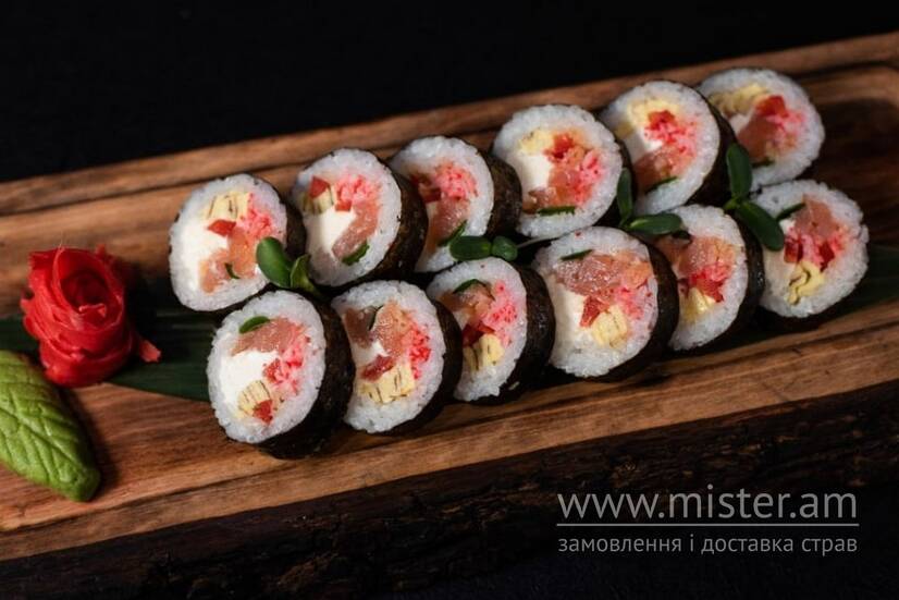 Рис, норі, крем сир, омлет, сурімі, перець болгарський, лосось копчений, кранч, цибуля зелена.