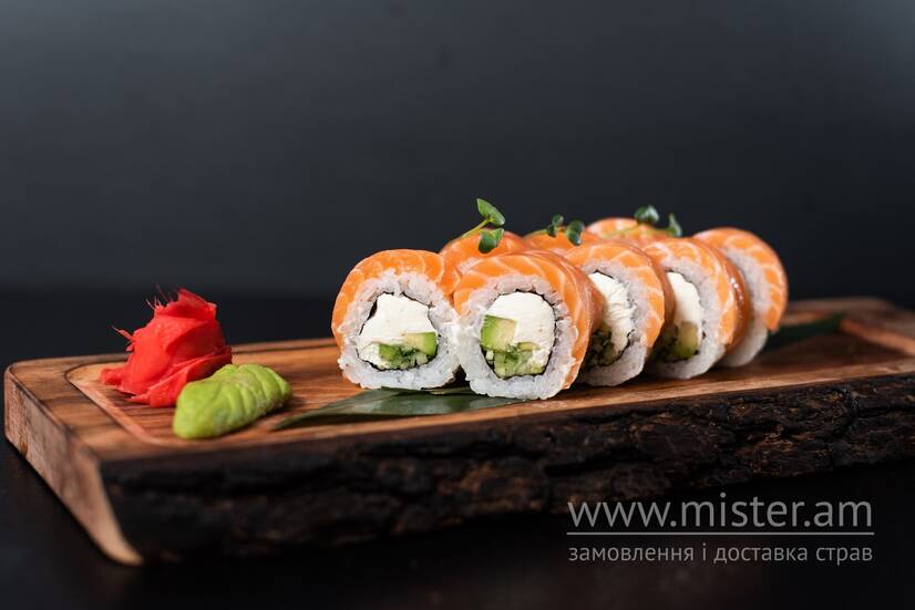 Рис, норі, сир Філадельфія, огірок, авокадо, лосось філе.
