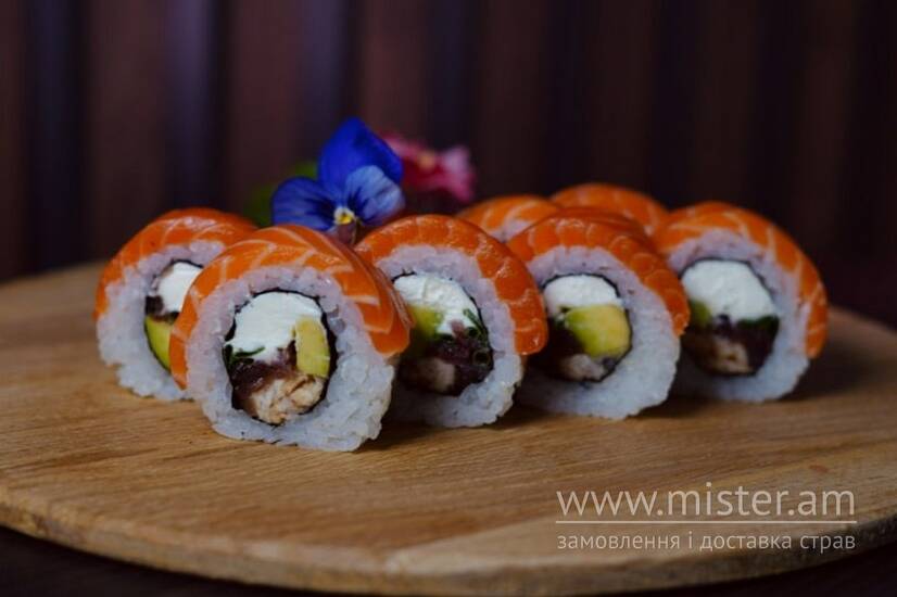 Рис, норі, крем сир, вугор, авокадо, лосось, цибуля.