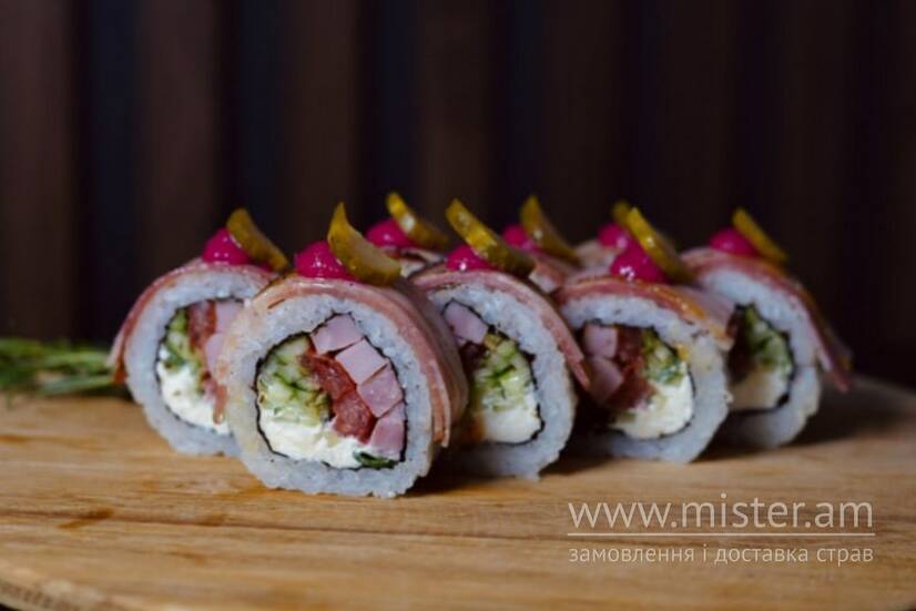 Рис, норі, крем сир, огірок свіжий, помідор, солоний огірок, бекон в'ялений, шинка варено-копчена, цибуля зелена, соус з хрону.