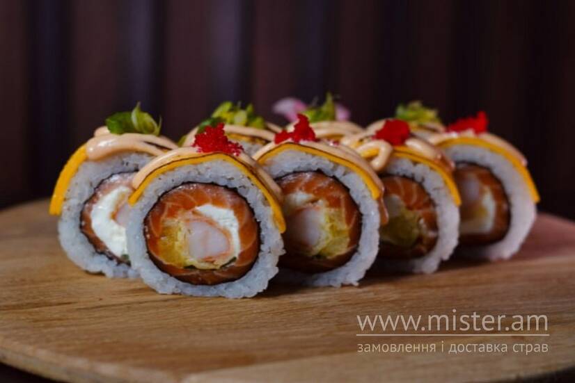Рис, норі, крем сир, лосось охолоджений, креветка темпура, такуан, ікра, цибуля, сир Чедр.