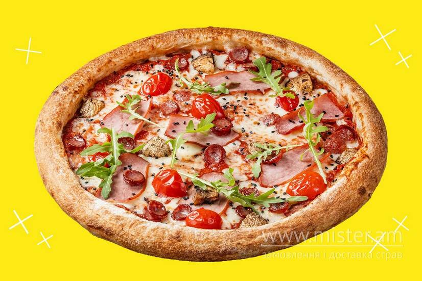 Сир моцарела, ковбаски мисливські, печериці мариновані, шинка, помідор свіжий, петрушка, соус томатний.
