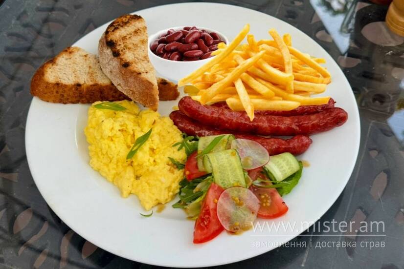 Яєчний скрембл, баварські ковбаски, картопля фрі, мікс салату, червона квасоля, тости.