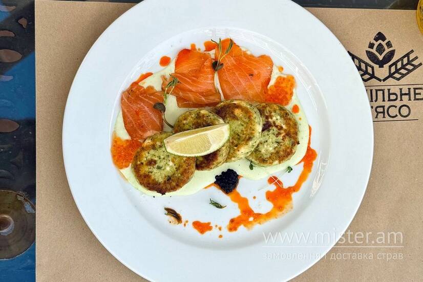 Хмільне М'ясо Шпинатні сирники з лососем та соусом з японського хріну