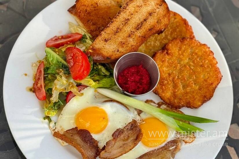 Смажена яєчня з підчеревиною, дерунами та грінками з ржаного хліба, гірчиця та стебло зеленої цибулі.