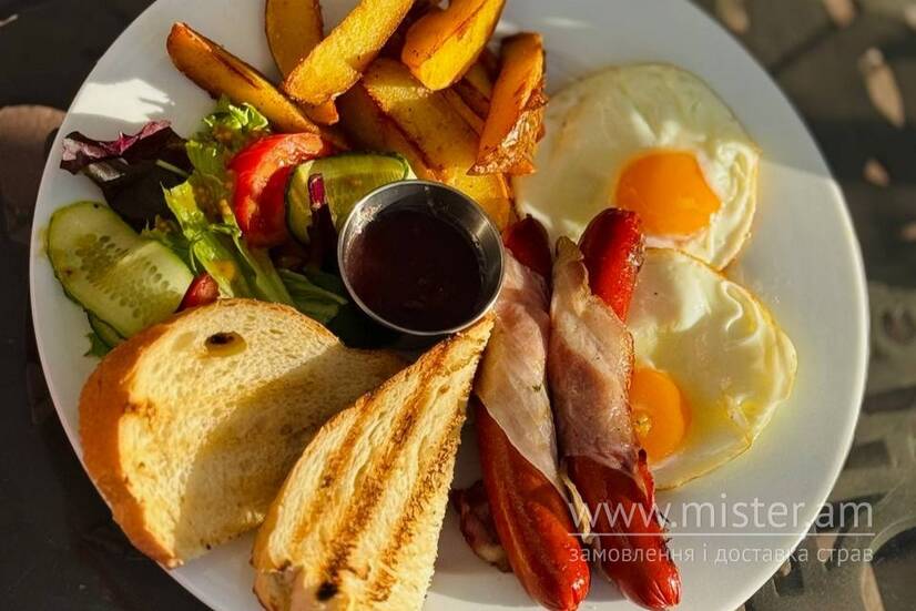 Смажені яйця, молочні сосиски, картопля по-селянськи, мікс салату, червона квасоля, тости.