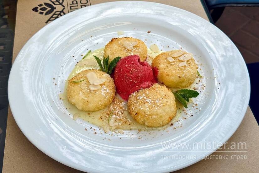 Хмільне М'ясо Запечені сирники з соусом із білого шоколаду та вишневим сорбетом
